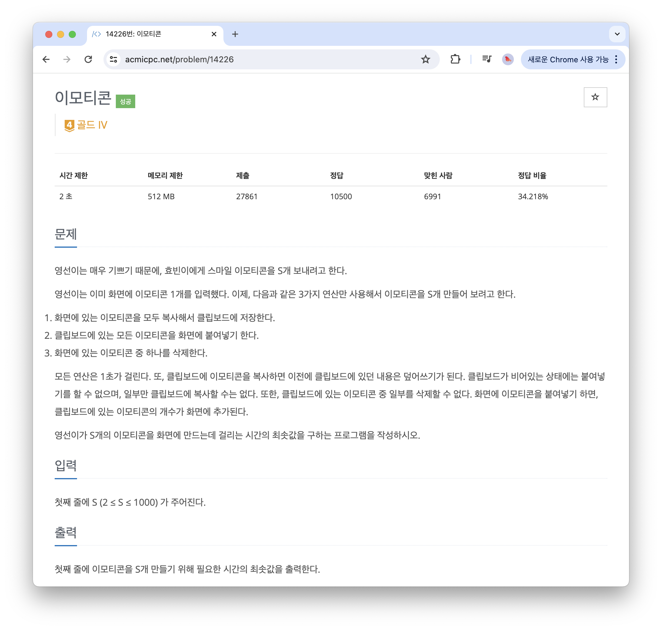 BFS를 활용해서 풀었고, 이모티콘, 클립보드, 시간을 queue에 넣어줬다. 또한 방문은 visited 2차원 배열을 사용했다. 왜냐하면 클립보드에 저장한다는 특수한 조건이 있어서 2차원 배열로 저장했다.